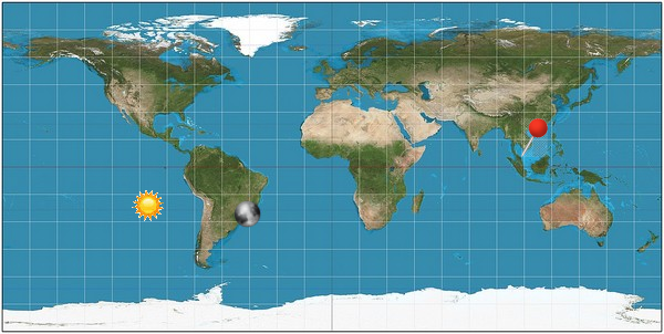 Elongasi Matahari-Bulan adalah jarak sudut pemisahan antara pusat cakera Matahari ke pusat cakera Bulan berdasarkan visual pemerhati. Sudut < 1° menunjukkan gerhana matahari tempatan. Sudut ±180° menunjukkan gerhana bulan. Gerhana mungkin tidak kelihatan dari lokasi anda.