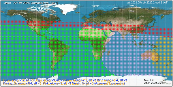Pemetaan memaparkan Kriteria MABIMS 2016 (Biru ke Hijau) dengan tambahan kriteria saduran model Odeh, Shaukat dan McNally (Kuning).